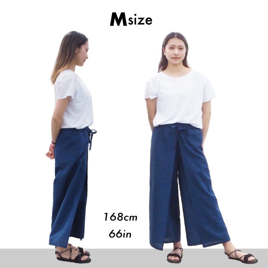 フリーサイズのMを基本サイズとして、長さ、ヒップ幅の違いで展開。ウエストはゴム+紐で調整できます。ヒップのサイズ +10cm〜ぐらい、少し大きめのサイズでゆったりはくと、ゆったり着れます。丈は洗濯で縮むのを想定したサイズとなっています(素材によって変わります)。