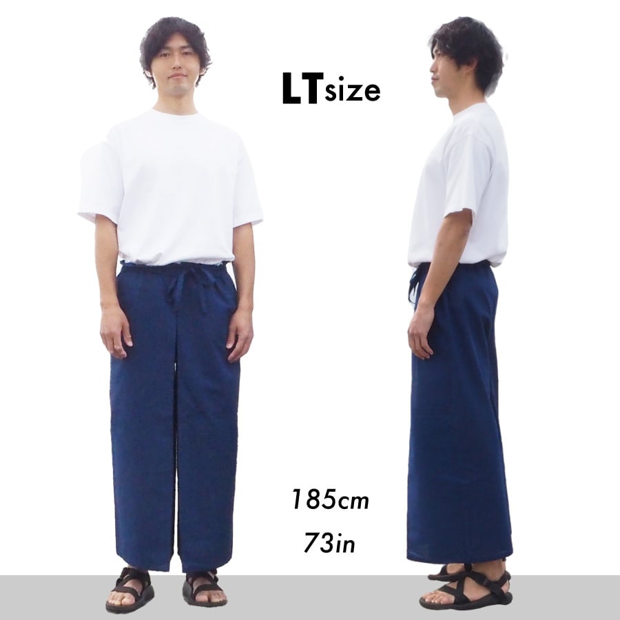 フリーサイズのMを基本サイズとして、長さ、ヒップ幅の違いで展開。ウエストはゴム+紐で調整できます。ヒップのサイズ +10cm〜ぐらい、少し大きめのサイズでゆったりはくと、ゆったり着れます。丈は洗濯で縮むのを想定したサイズとなっています(素材によって変わります)。
